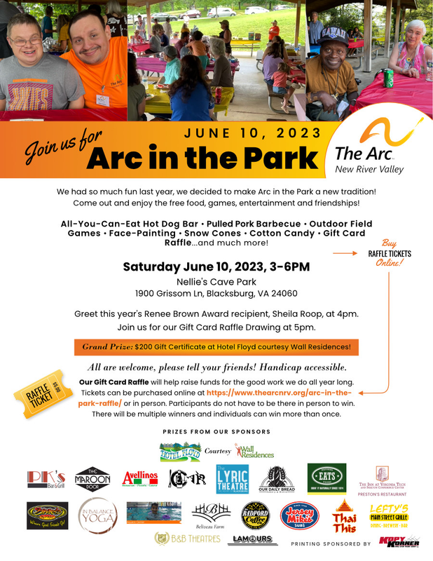 The Arc of the New River Valley presents Arc in the Park 2023 on Saturday, June 10, 2023 outside at Nellie's Cave Park.
