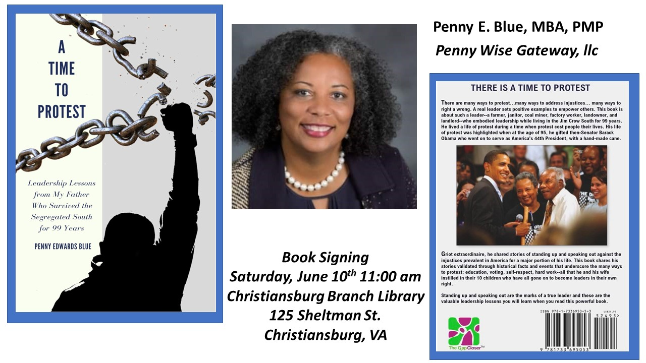 Join us for a talk with Penny Blue about her first book "A Time to Protest: Leadership Lessons from My Father Who Survived the Segregated South for 99 Years".