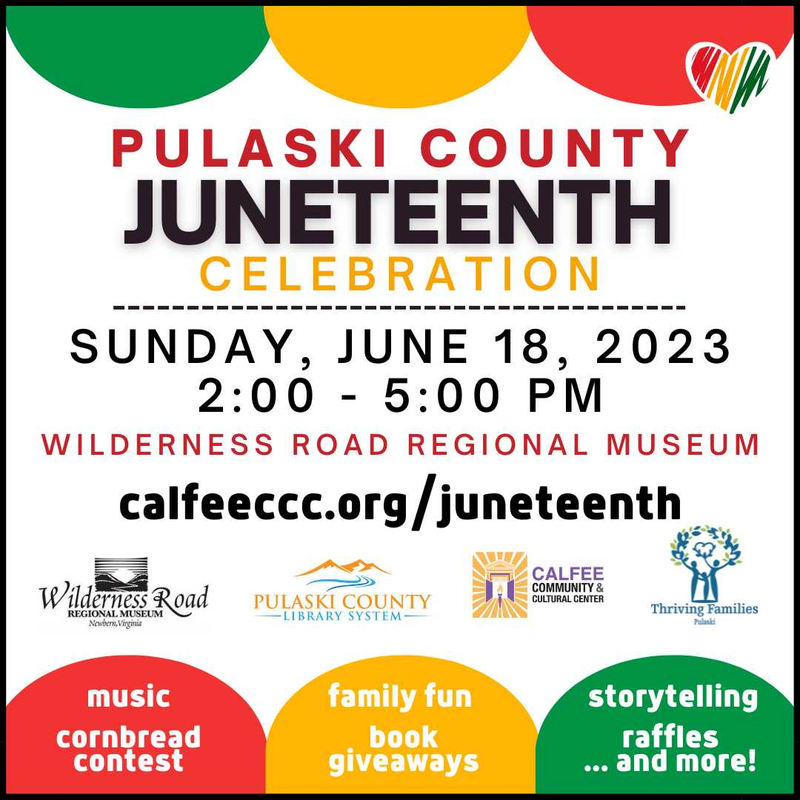 The Calfee Community & Cultural Center, Pulaski County Library System, Thriving Families and Wilderness Road Regional Museum presents 2023 Pulaski County Juneteenth Celebration on Sunday, June 18, 2023 at the Wilderness Road Regional Museum.
