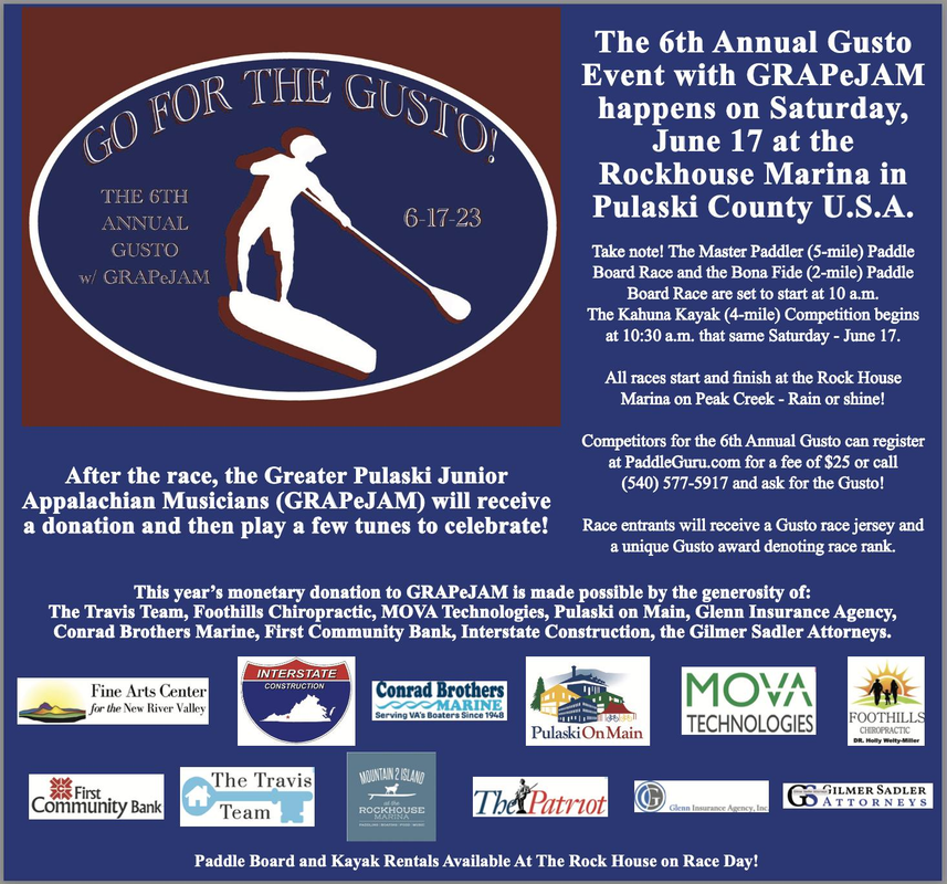 https://paddleguru.com/races/6thAnnualGustoEventwithGRAPeJAM or by calling 540-577-5917 and ask for the Gusto.