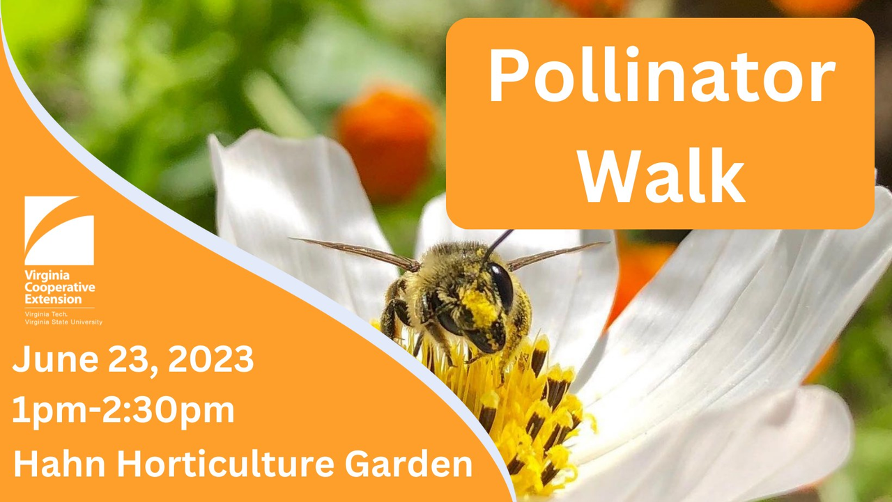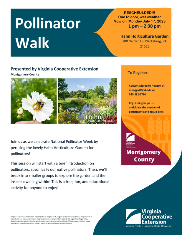 The Virginia Cooperative Extension of Montgomery County, VA presents a Pollinator Walk on Friday, June 23, 2023 at the Hahn Horticulture Garden at Virginia Tech.