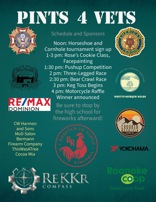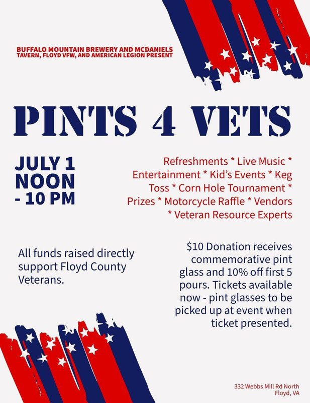 Buffalo Mountain Brewery presents Pints 4 Vets with the Floyd County Veterans of Foreign Wars and American Legion on Saturday, July 1, 2023.