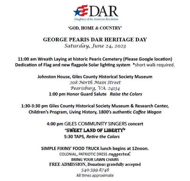 The Giles County Historical Society Museum and the Daughters of the American Revolution presents the George Pearis Heritage Day on Saturday, June 24, 2023 at the Giles County Historical Society Museum.