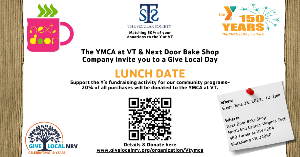 The Secular Society will be matching 50% of the donations to the YMCA at Virginia Tech from June 1-29, 2023.