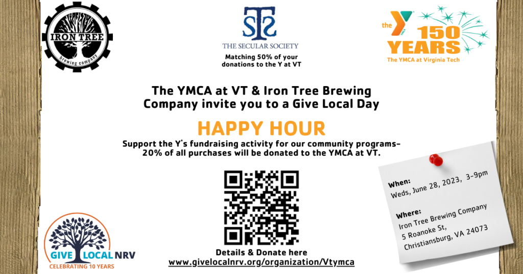 The Secular Society will be matching 50% of the donations to the YMCA at Virginia Tech from June 1-29, 2023.