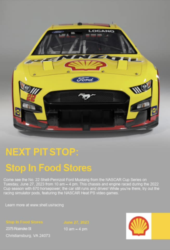 Enjoy free hot dogs and other goodies. See the #22 Shell-Pennzoil Ford Mustang from the NASCAR Cup Series. The chassis and engine raced during the 2022 Cup season with 670 horsepower and the car still runs and drives! While you are there, try out the racing simulator pods featuring the NASCAR Heat PS video games.