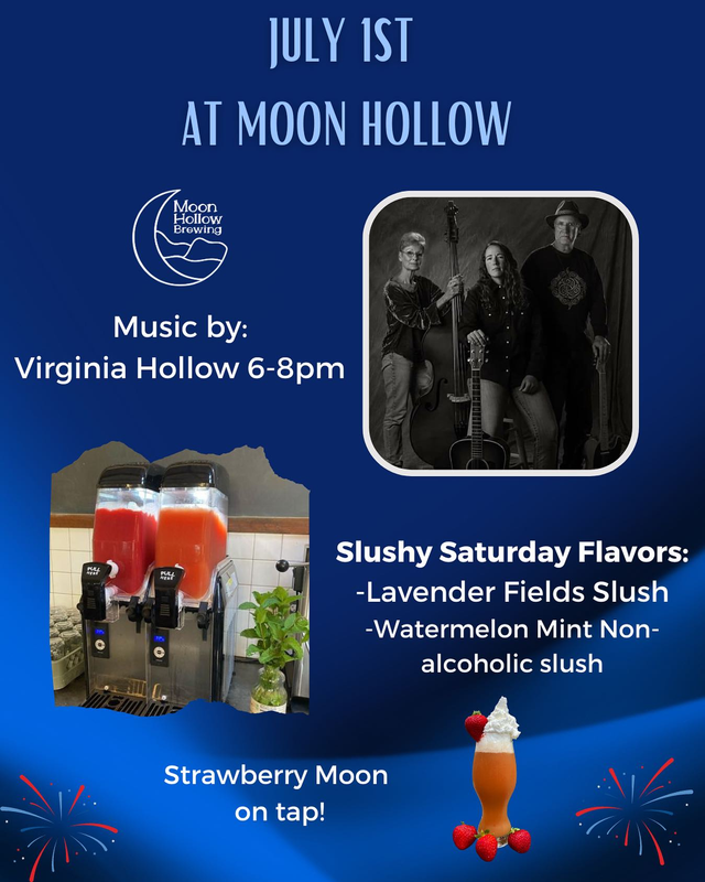 https://www.facebook.com/virginiahollowband/It's also Slushy Saturday with the flavors Lavender Fields Slush and Watermelon Mint Non-Alcoholic Slush. And, Strawberry Moon will be on tap.