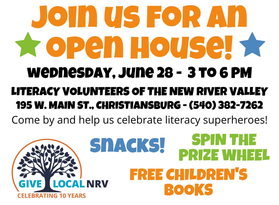 The Literacy Volunteers of the New River Valley presents the 2023 Literacy Volunteers of the NRV Open House for GiveLocalNRV on Wednesday, June 28, 2023 at their office in Christiansburg, VA.