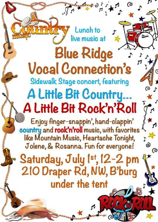 Blue Ridge Vocal Connection presents a Sidewalk Stage Concert titled "A Little Bit Country... A Little Bit Rock'n' Roll" on Saturday, July 1, 2023 under the food tents on Draper Road in downtown Blacksburg, VA.