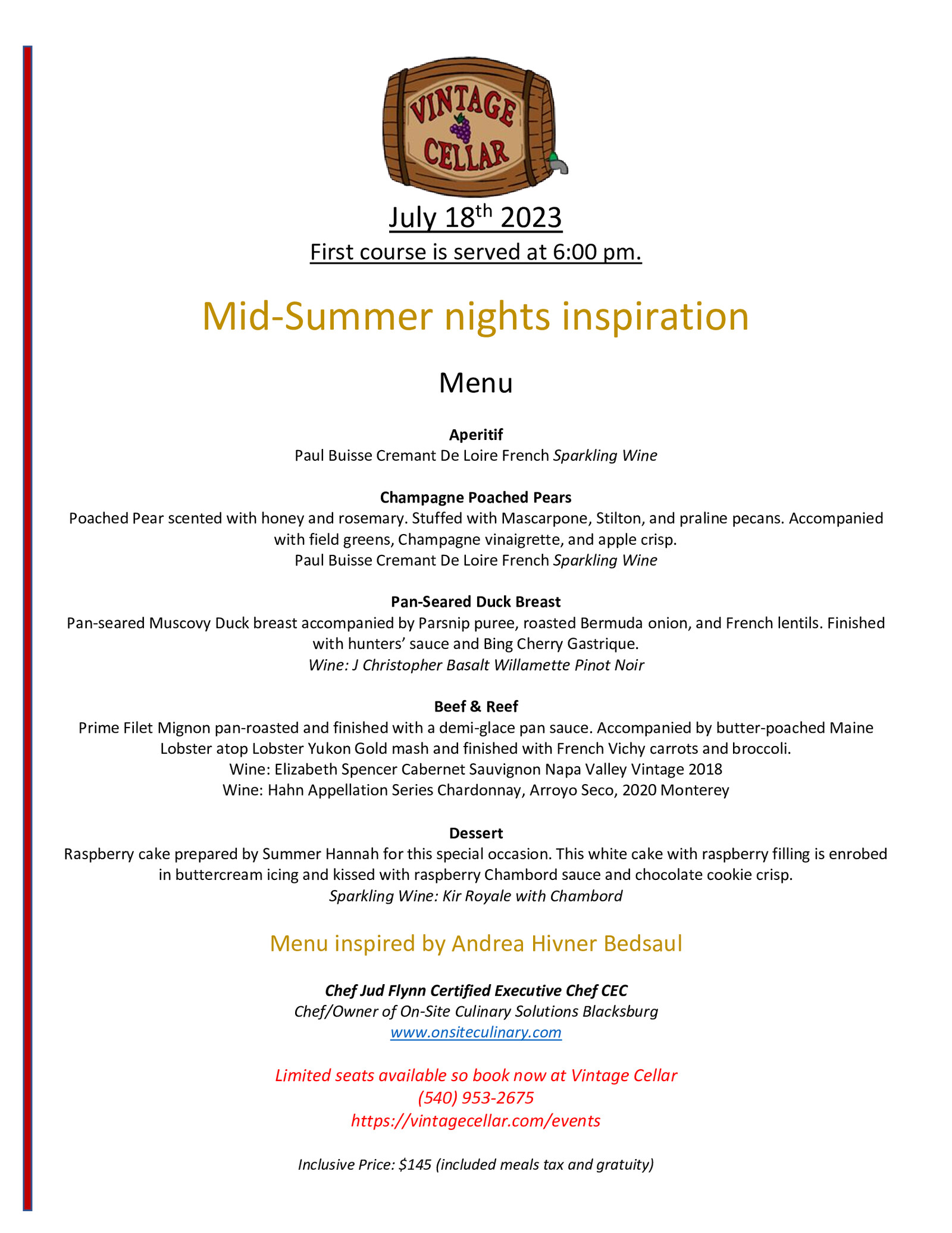 Vintage Cellar presents a Mid-Summer Nights Inspiration on Tuesday, July 18, 2023.
