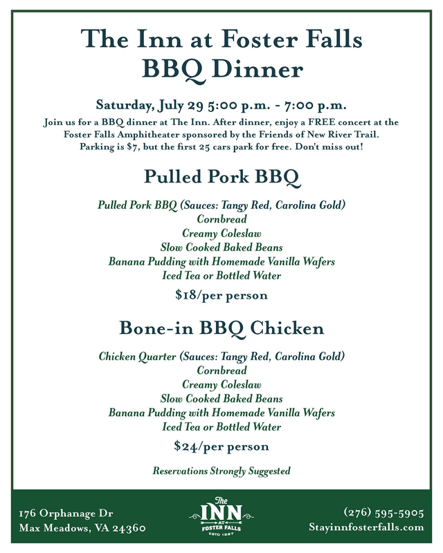 The Inn at Foster Falls presents a BBQ Dinner on Saturday, July 29, 2023.