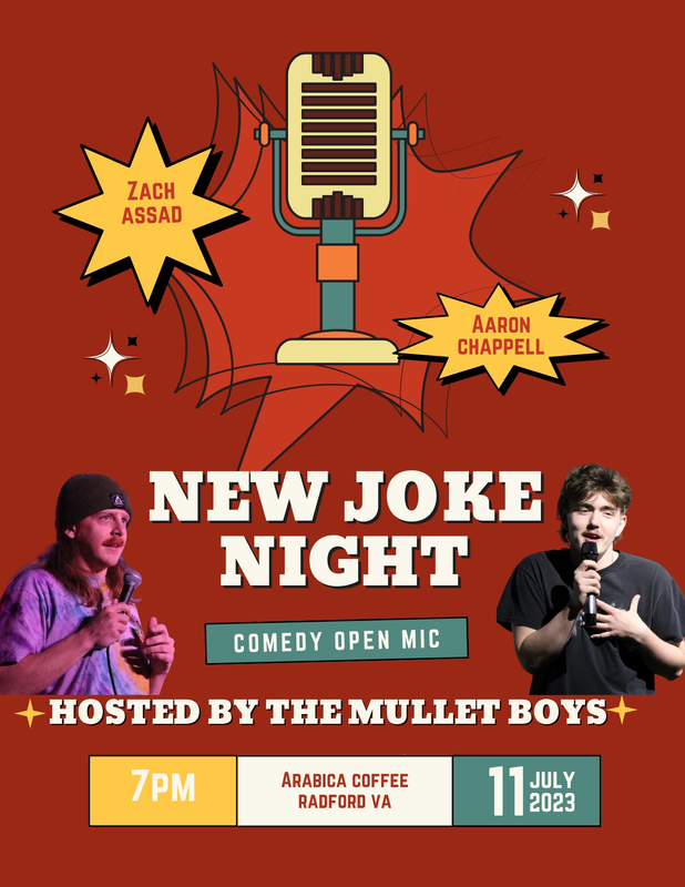 The Mullet Boys presents a Comedy Open Mic New Joke Night on Tuesday, July 11, 2023 at Arabica Cafe in Radford, VA.