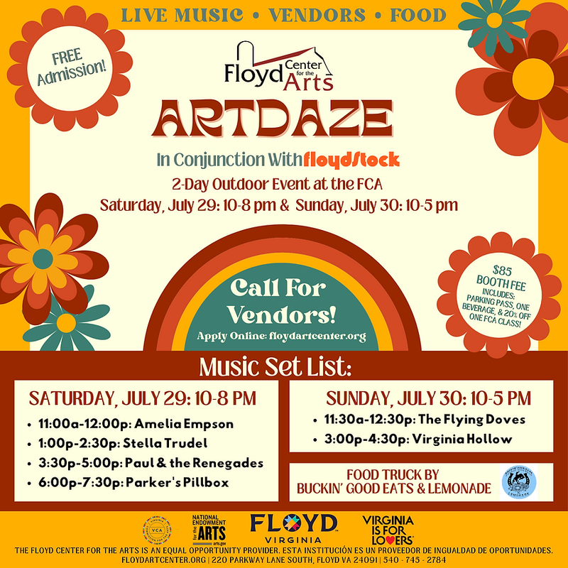 ArtDaze is a community event that is free and open to the public. Come support the talented artists of Floyd and join in community with us for a weekend full of summer fun outside in The Floyd Center for the Arts field.