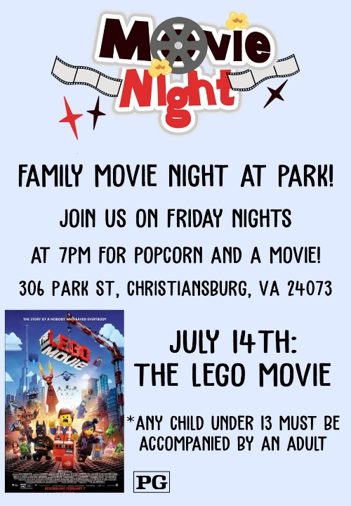 Park United Methodist Church presents a Family Movie Night featuring the "The Lego Movie" on Friday, July 14, 2023.