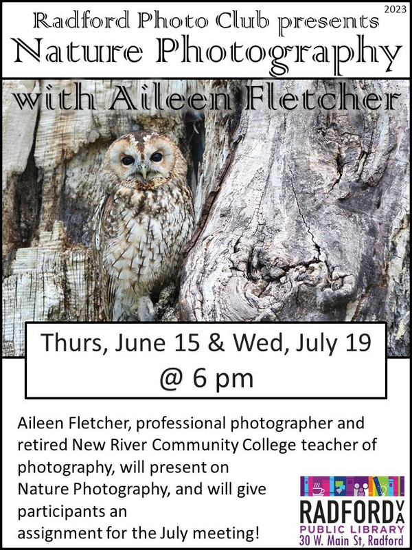 Aileen Fletcher, professional photographer and retired New River Community College teacher of photography, will present on Nature Photography, and will give participants an assignment for the July meeting.