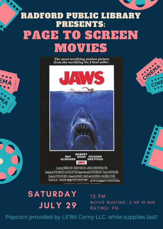 The Radford Public Library continues their Page to Screen Movies series featuring the original 1975 "Jaws" on Saturday, July 29, 2023.