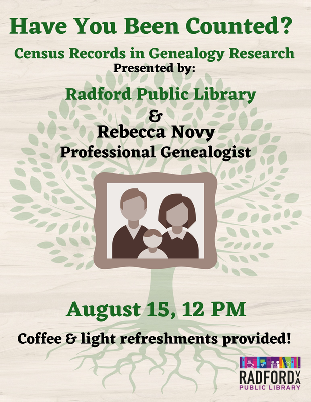 The Radford Public Library presents the program "Have You Been Counted? Census Records in Genealogy Research" on Tuesday, August 15, 2023.
