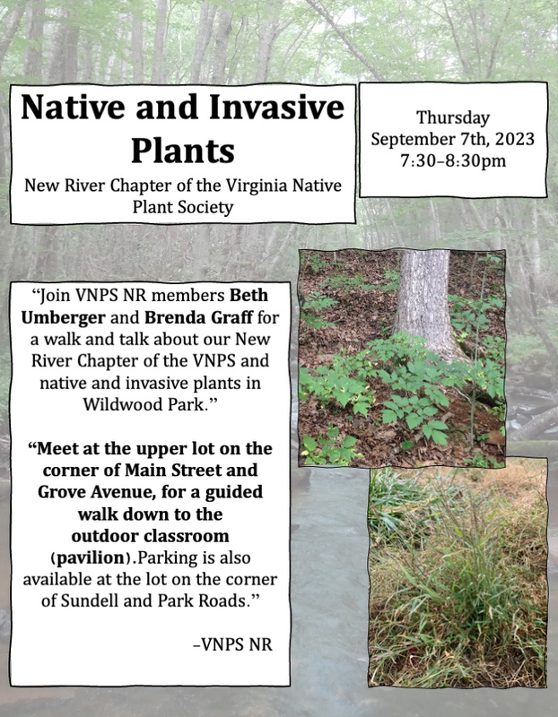The 2023 Wildwood Outdoor Classroom Summer Lecture Series continues with the program "Native Plants" with the Virginia Native Plant Society on Thursday, September 7, 2023 at the Outdoor Pavilion at Wildwood Park in Radford, VA.