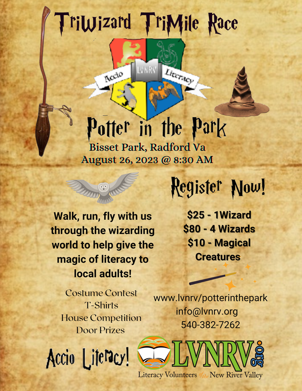 Literacy Volunteers of the New River Valley presents the 2023 TriWizard TriMile Potter in the Park Fun Run on Saturday, August 26, 2023 at Bisset Park in Radford, VA.