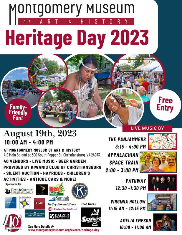 The Montgomery Museum of Art and History will celebrate its annual Heritage Day on Saturday, August 19, 2023 at the museum, at 300 Pepper Street in Christiansburg, VA and along Main Street in downtown Christiansburg, VA.