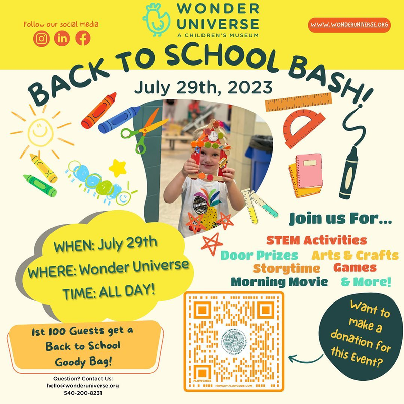 Wonder Universe: A Children's Museum presents their 3rd Annual Back to School Bash on Saturday, July 29, 2023.
