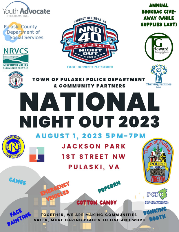 Join the Town of Pulaski Police Department and other community groups including NRV Cares, Pulaski Ruritans and the Pulaski Library System for National Night Out 2023! The event will include free face painting, emergency vehicles on display, meet the officers & other first responders, free snacks, popcorn, cotton candy, dunking booth and more!