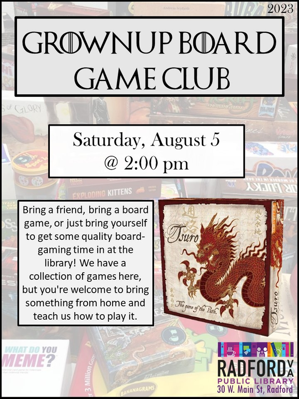 Radford Public Library presents Grown Up Board Game Club on Saturday, August 5, 2023.