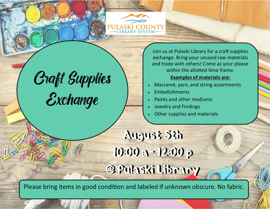 Pulaski County Library presents a Craft Supplies Exchange on Saturday, August 5, 2023.