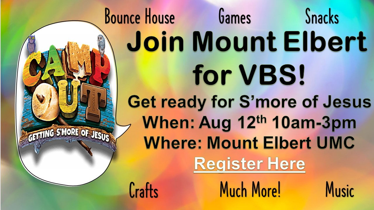 Mount Elbert United Methodist Church presents their VBS Campout on Saturday, August 12, 2023.