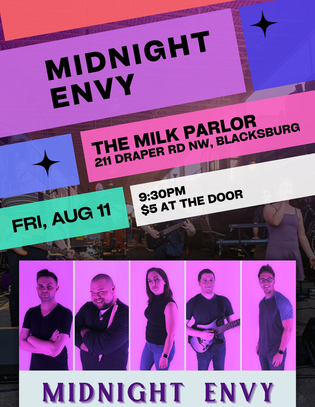 Midnight Envy is an alternative pop cover band and was founded in 2022 by a group of Roanoke, VA-based musicians and friends with a goal to perform great music in Southwest Virginia. Creating a high-energy, audience oriented experience, Midnight Envy’s influences range from artists as Foster the People, Miley Cyrus, Maroon 5, Paramore and more.