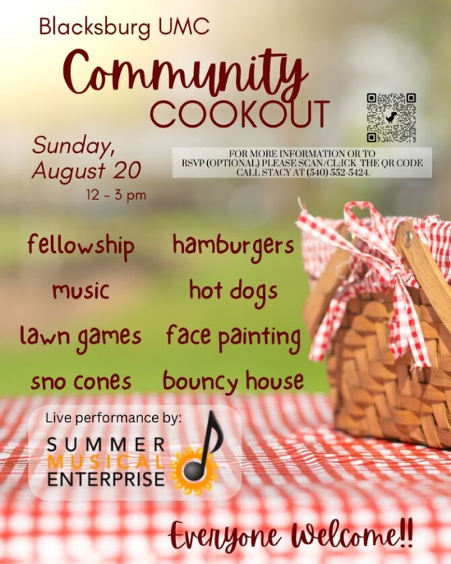 Blacksburg United Methodist Church presents the BUMC Community Cookout on Sunday, August 20, 2023.