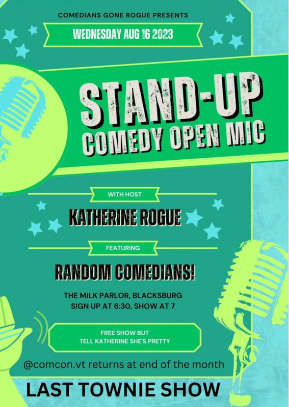 Join Host Katherine Rogue featuring random comedians in a fun night of laughs. The is the last townie show of the semester. After this show, students will be returning and The Comedy Conglomerate at Virginia Tech will take over the stage.