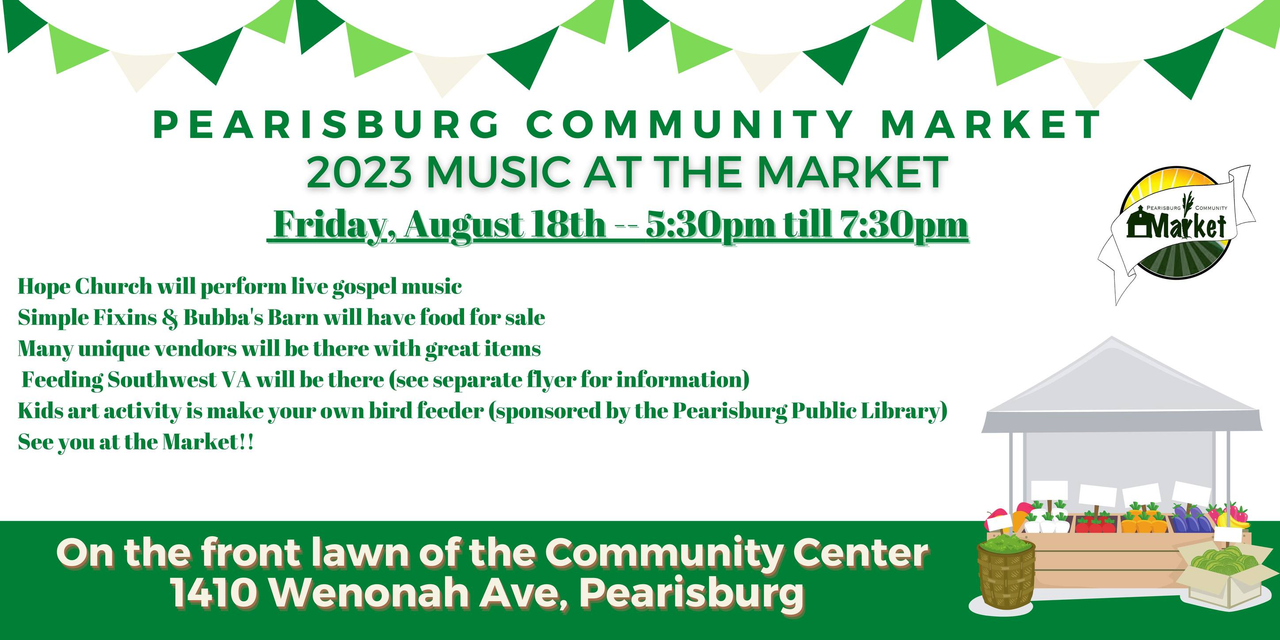 The Pearisburg Community Market continues their 2023 Music at the Market series featuring Hope Church performing live gospel music on Friday, August 18, 2023 on the lawn of the Pearisburg Community Center.