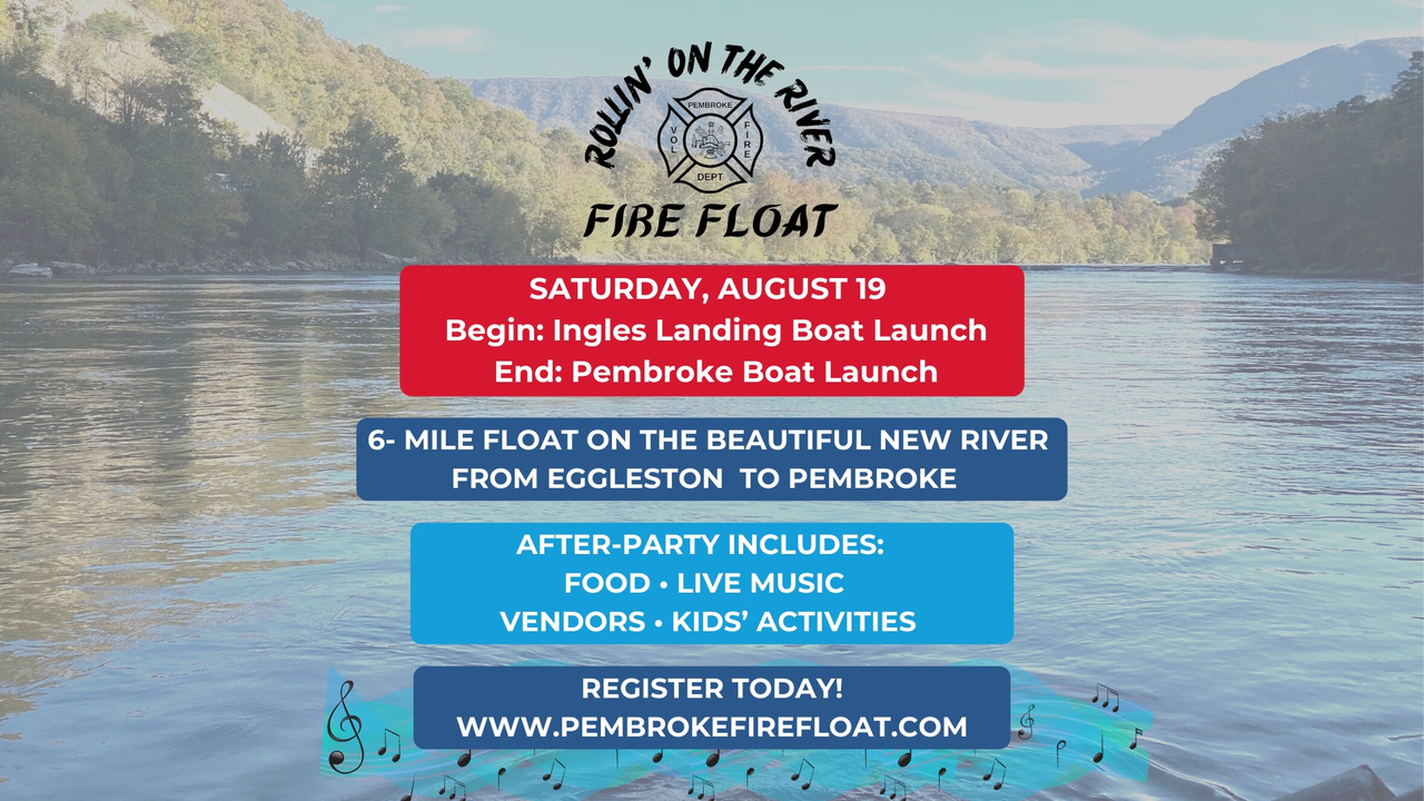 The Pembroke Volunteer Fire Department presents the 2023 Rollin' On The River Fire Float on Saturday, August 19, 2023 starting at the Ingles Landing Boat Launch in Eggleston, VA.