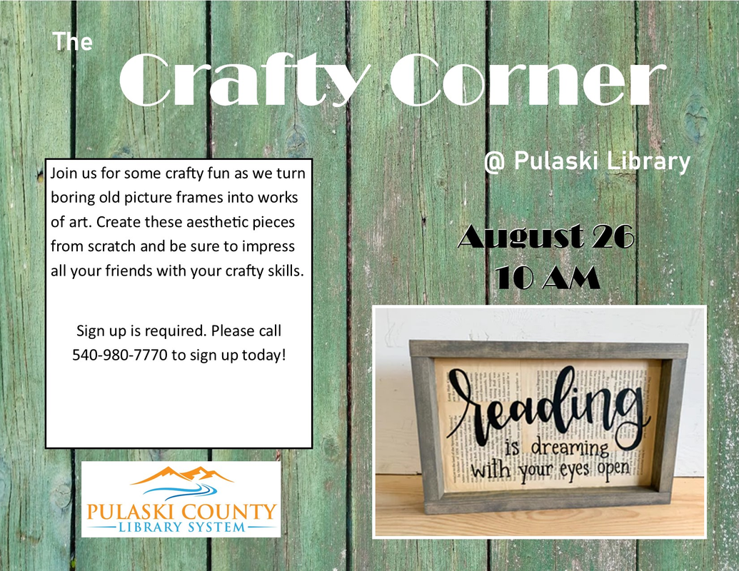Pulaski County Library continues The Crafty Corner series with "Picture Frame Decor" on Saturday, August 26, 2023.