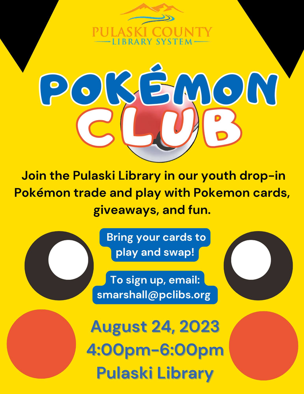 Pulaski County Library presents Pokemon Trade-and-Play on Thursday, August 24, 2023.