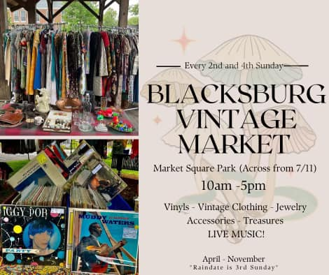 The Blacksburg Vintage Market hosts their August Vintage Market on Sunday, August 27th, 2023 at Market Square Park in downtown Blacksburg, VA.