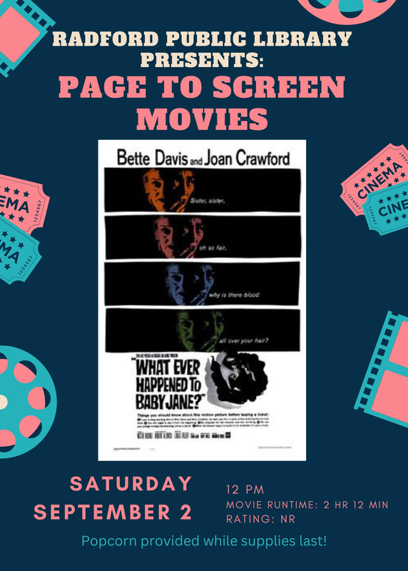 The Radford Public Library continues their Page to Screen Movies series with "Whatever Happened to Baby Jane?" on Saturday, September 2, 2023.