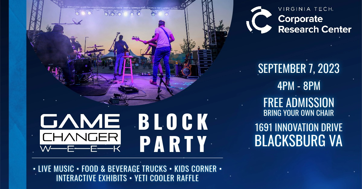 The Block Party will be held at 1691 Innovation Drive in Blacksburg, VA with the Virginia Tech Corporate Research Center.