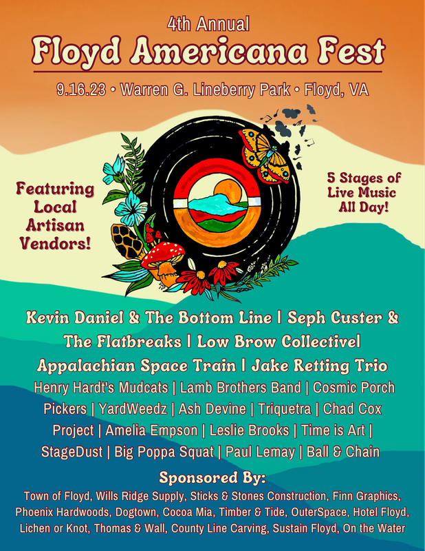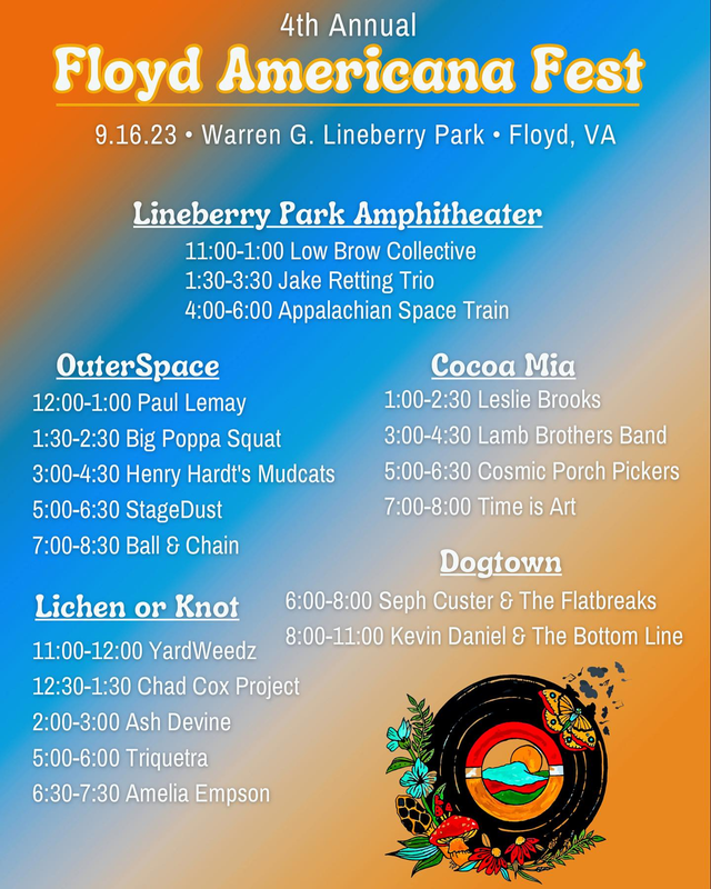 The Fourth Annual Floyd Americana Fest will be held on Saturday, September 16, 2023 at five stages in Floyd, VA including Warren G. Lineberry Memorial Park, Lichen Or Knot, Outerspace, Cocoa Mia and Dogtown Roadhouse.