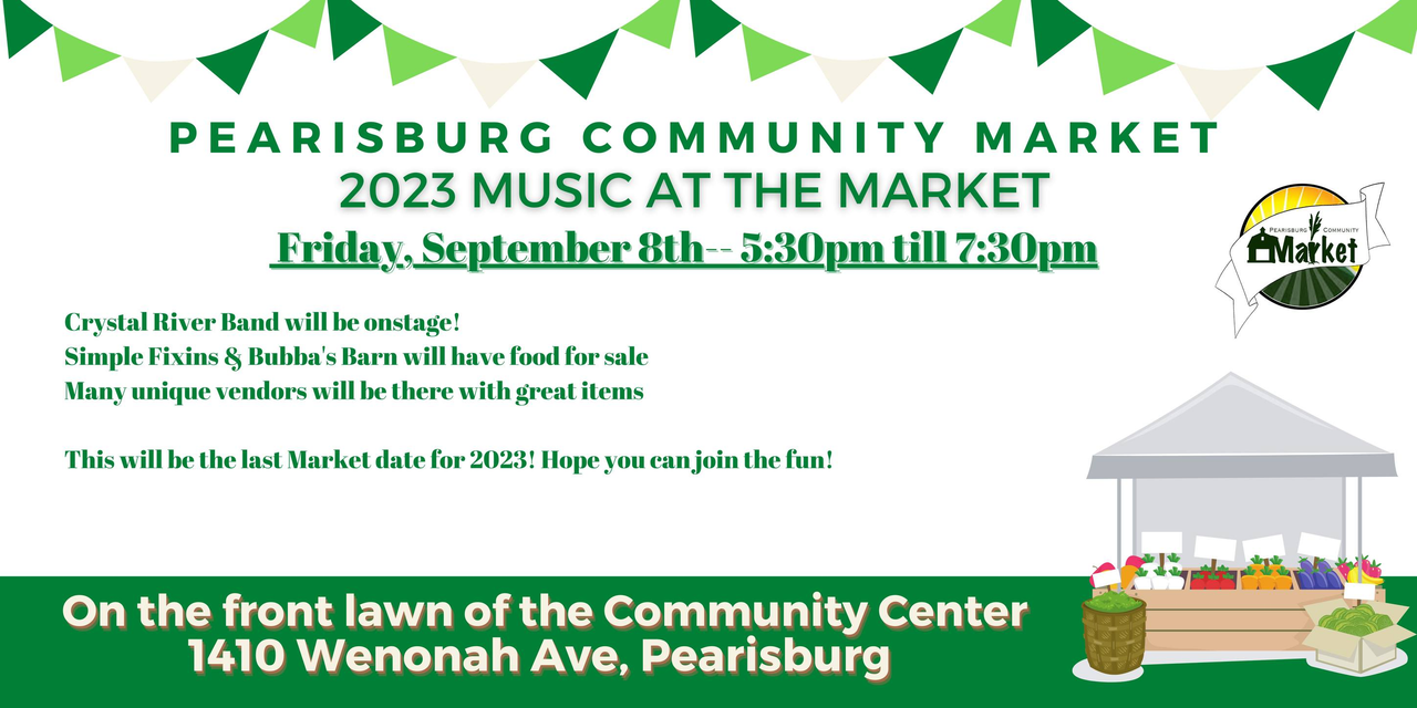 The Pearisburg Community Market wraps up their 2023 Music at the Market series featuring the Crystal River Band performing on Friday, September 8, 2023 on the lawn of the Pearisburg Community Center.