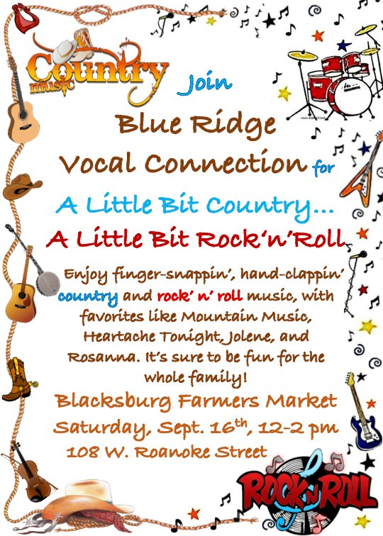 The Blacksburg Farmers Market presents a free concert from Blue Ridge Vocal Connection titled "Little Bit Country...Little Bit Rock'n'Roll" along with the regular farmers market vendors on Saturday, September 16, 2023 at Market Square Park.