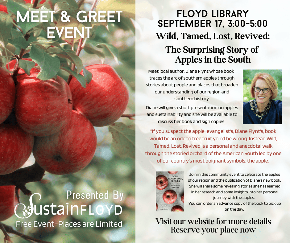 https://sustainfloyd.org/events/the-surprising-story-of-apples-in-the-south/. You can also reserve a copy of Diane's book at the RSVP link.