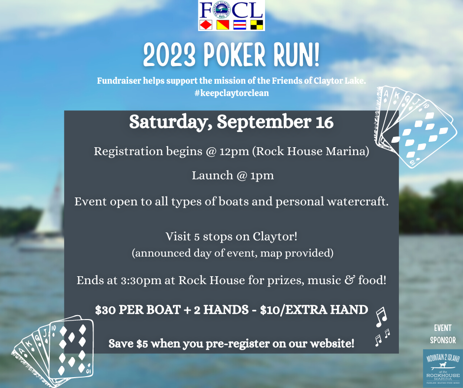 The Friends of Claytor Lake (FOCL) present their 2023 Poker Run on the Water on Saturday, September 16, 2023 starting and ending at Rock House Marina.
