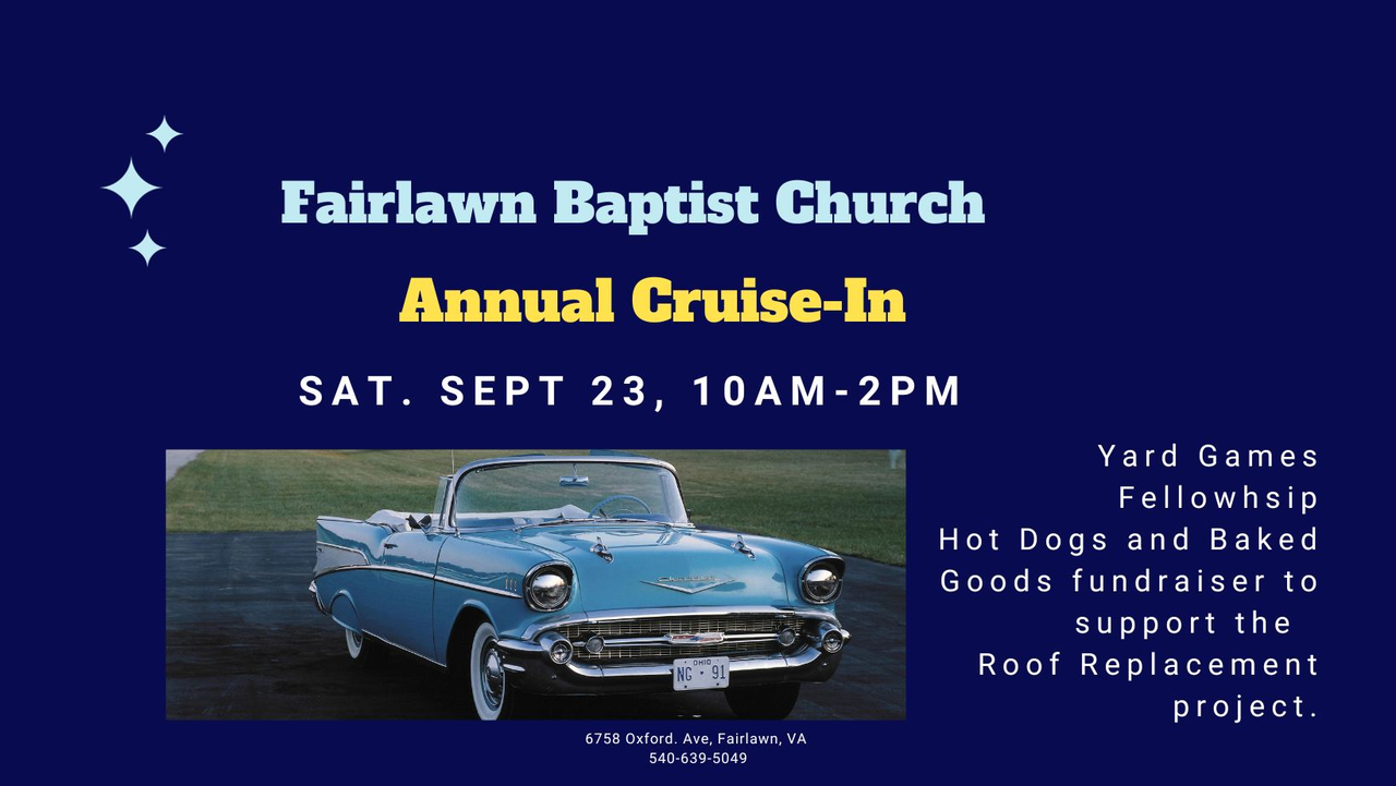 Fairlawn Baptist Church presents their Annual Cruise-In on Saturday, September 23, 2023.