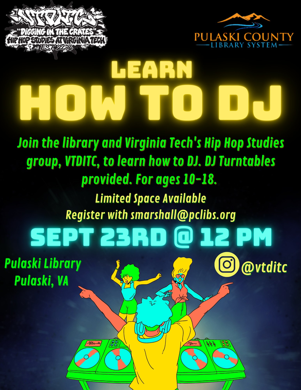 Join the library as we partner with Virginia Tech's VTDITC Hip Hop Studies Group for "How to DJ!". DJ turntables will be provided for the class.