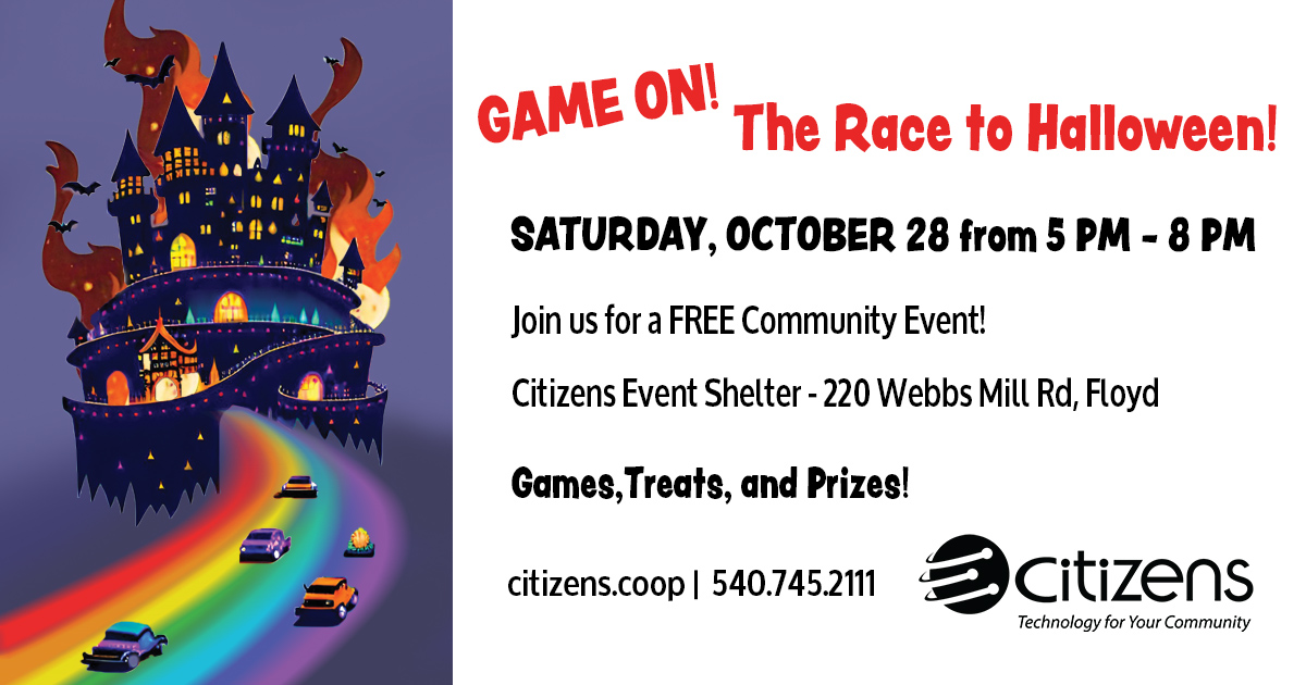 Citizens Telephone Coop presents their Annual Halloween Event titled "Game On! The Race to Halloween" on Saturday, October 28, 2023 at the Citizens Multi-Purpose Shelter in Floyd, VA.