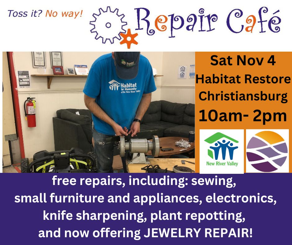 The New River Valley Timebank and the Habitat for Humanity ReStore presents the 2023 Fall Repair Cafe on Saturday, November 4, 2023.