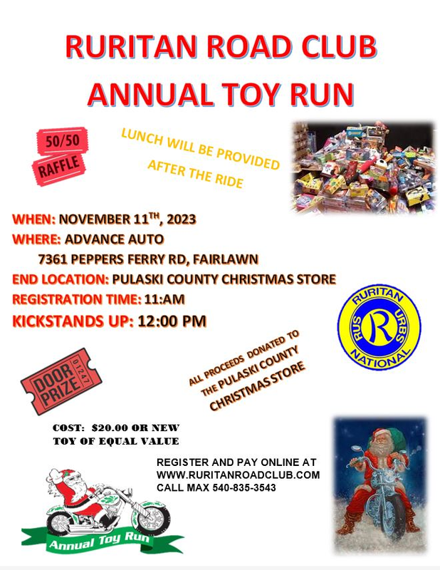 The Ruritan Road Ruritan Club presents the 2023 Annual Toy Run for the Pulaski County Christmas Store on Saturday, November 11, 2023 starting at Advance Auto Parts in Fairlawn, VA.