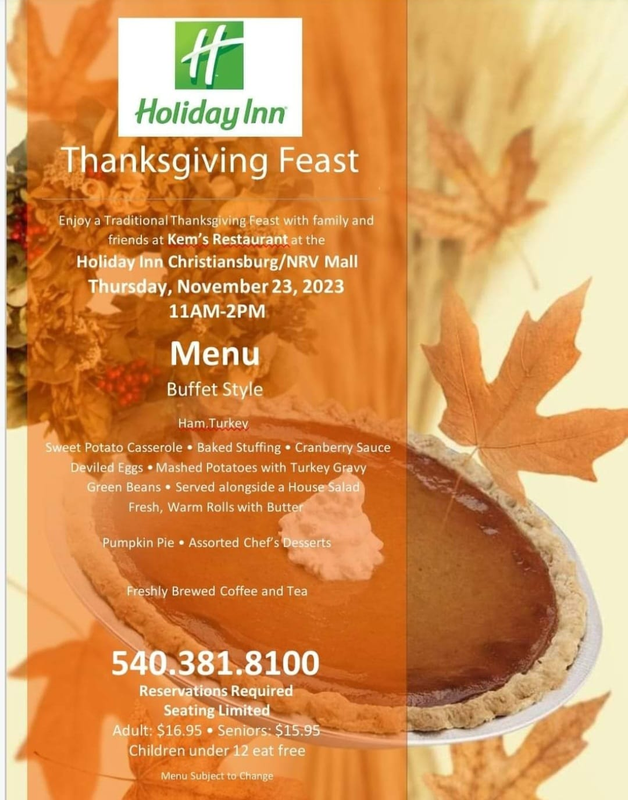 Holiday Inn in Christiansburg presents their annual Thanksgiving Feast Buffet on Thursday, November 23, 2023.